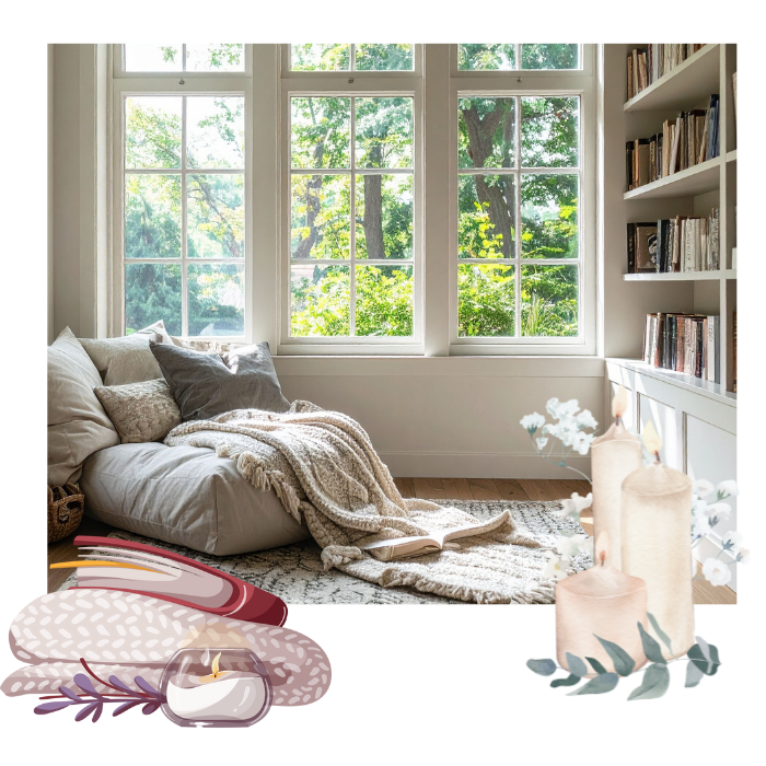 - Use soft textures, calming scents, and warm light